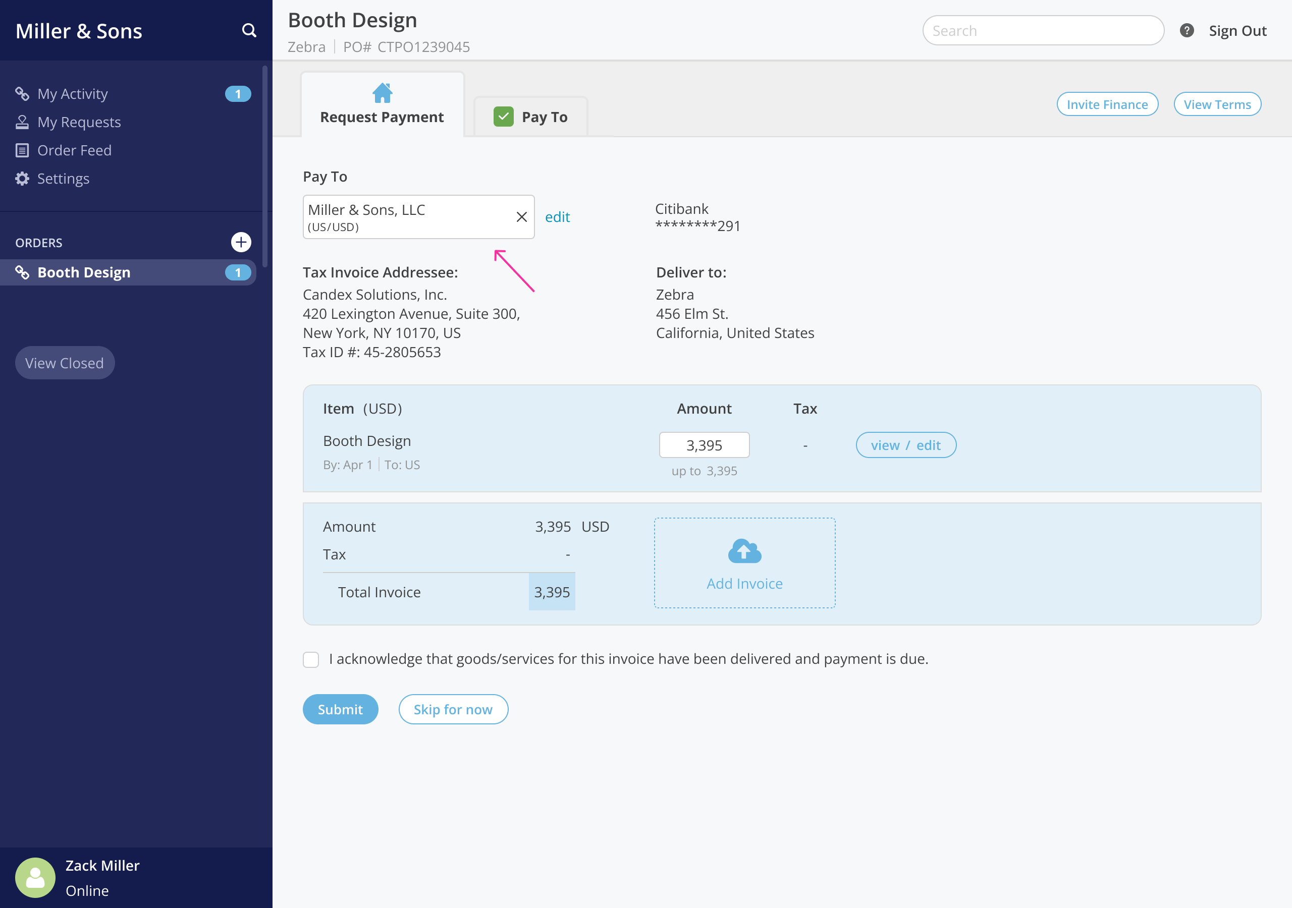 When you are accepting the first order to your company, you will be asked to add banking details. Afterwards, anyone from your company can use that banking entity or add additional ones if necessary.
